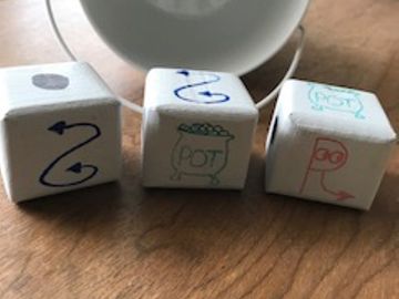 Game of three is a fast paced game. The three dice tell your three coins what to do. Left, safe, right or center pot are the codes on these 2 inch size dice. Great for table play indoors or out.