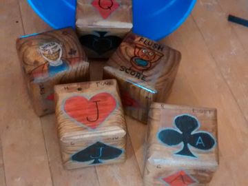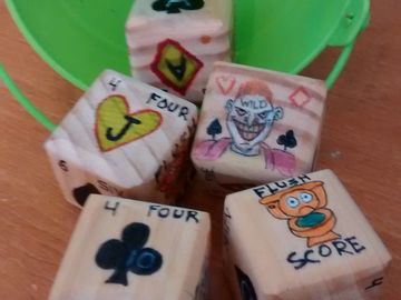 Yard dice are made from wood with drilled holes. All are unique. They have 5 different games and an expo marker for the score keeper to track while playing.
